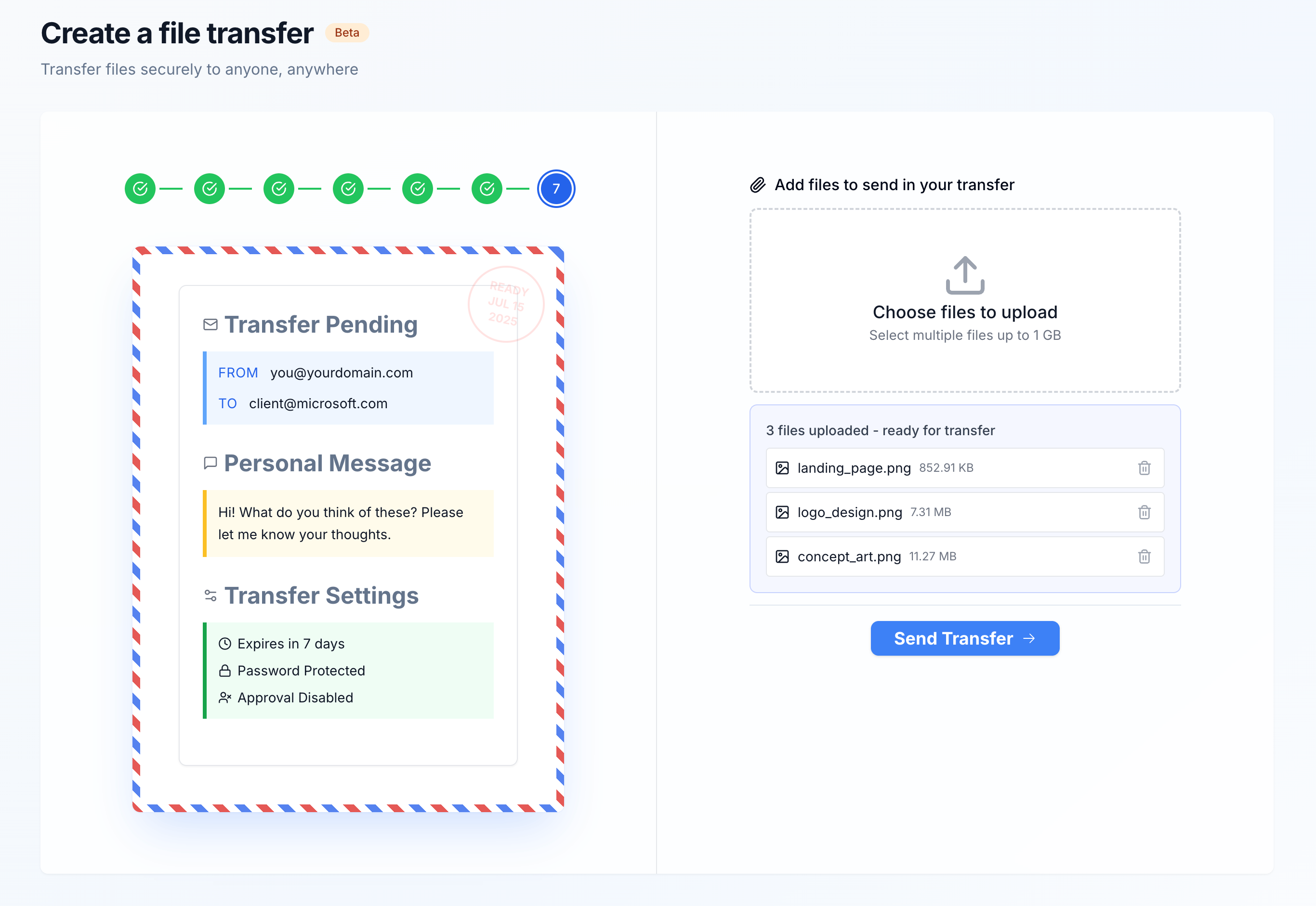 Every transfer is end-to-end encrypted, with options for password protection and expiration dates to keep sensitive files safe.